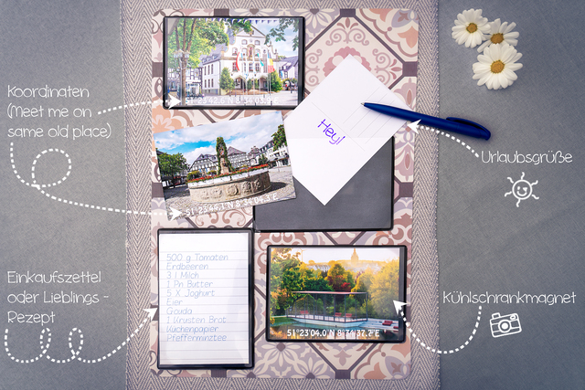 Im Set sind magnetische Sichtumschläge enthalten, die Du nutzen kannst, um die Postkarten oder Notizzettel, Einkaufslisten, Rezepte oder Erinnerungen flexibel und wieder spurlos ablösbar zu befestigen.