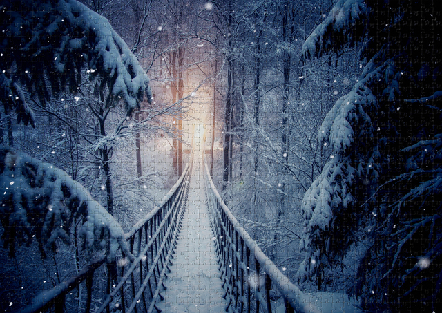Traumhaftes 1000 teiliges Puzzle "Seilbrücke im Winterwald" zeigt, umgeben von schneebedeckten Tannen, eine Seilbrücke aus dem Winterwald im Sauerland. Sie liegt am Rothaarsteig in der Nähe von Schmallenberg. Am Ende der Brücke leuchtet ein magisches Licht.